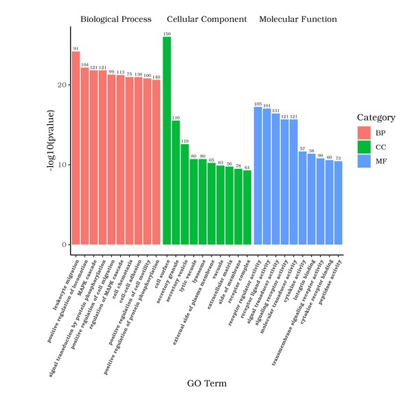 GO is the abbreviation of Gene Ontology (http://www.geneontology.org/), which is a major bioinformatics classification system to unify the presentation of gene properties across all species. It includes three main branches: cellular component, molecular function, and biological process. GO terms with padj < 0.05 are significant enrichment.